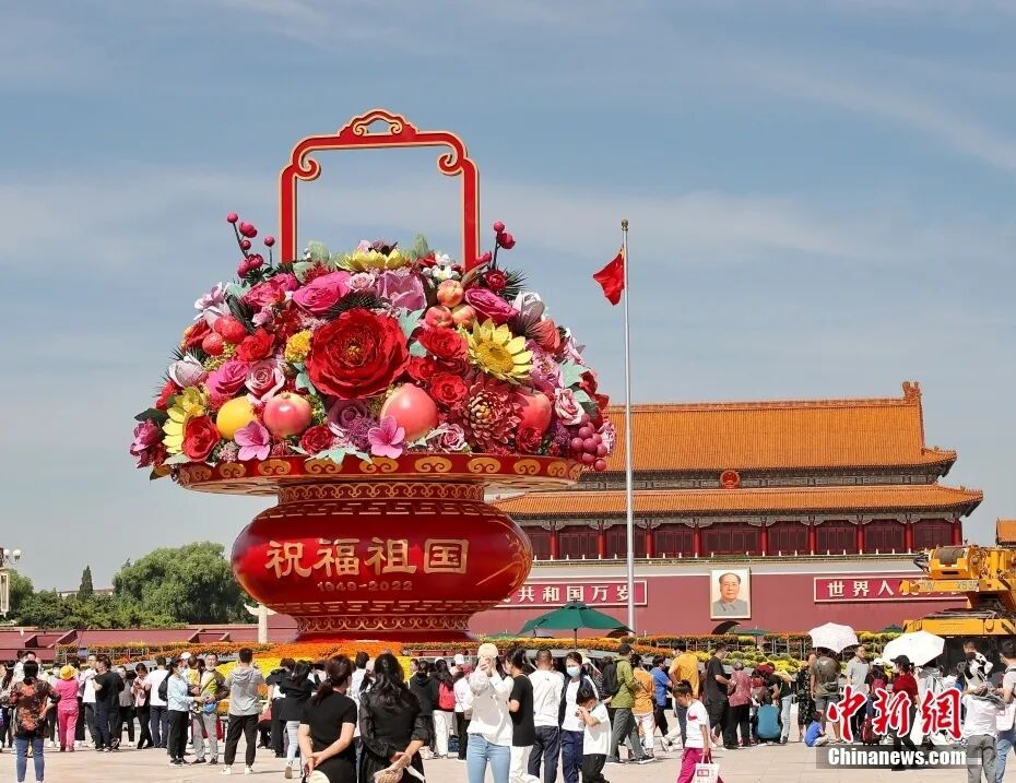 9月24日,北京天安门广场“祝福祖国”巨型花篮主体亮相,吸引众多市民游客前来打卡抢先拍照留影。王新 摄 图片来源:视觉中国