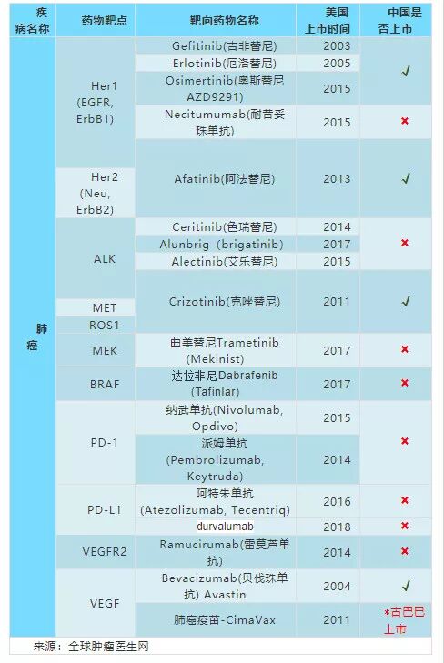 药物治疗是所有癌症治疗应用最广泛的方法。NSCLC是目前获批靶向药最多的癌症,最常见的靶点包括:EGFR、ALK、BRAF、HER2、MEK、ROS1、PD-L1、VEGF等。具体药物清单如下: