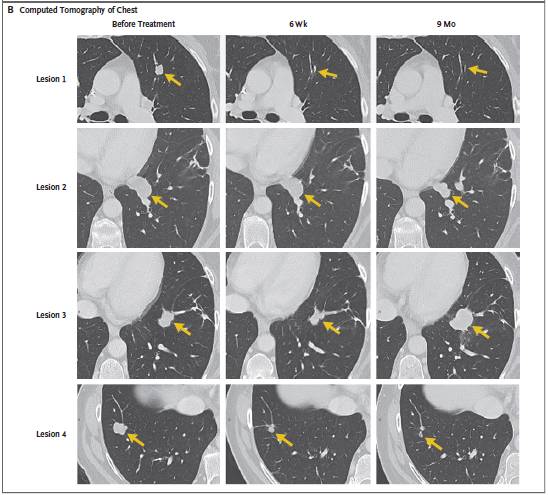 转移性结直肠癌患者肿瘤患者经过TIL细胞疗法治疗后,7个肺部的转移灶在几周后都变小乃至消失!