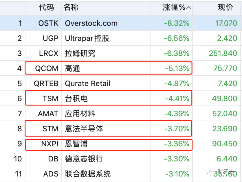 受到美国这两个声明的影响,美芯片股周五下挫,高通跌5.13%,台积电跌4.41%。