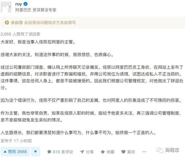 今年6月,一位阿里P8级员工公开招聘生活助理并答应给对方正式编制及1.6万元/月包养费用的丑闻不断在网上发酵。涉事员工的主管也已在知乎上就相关事件做出了回应。👇