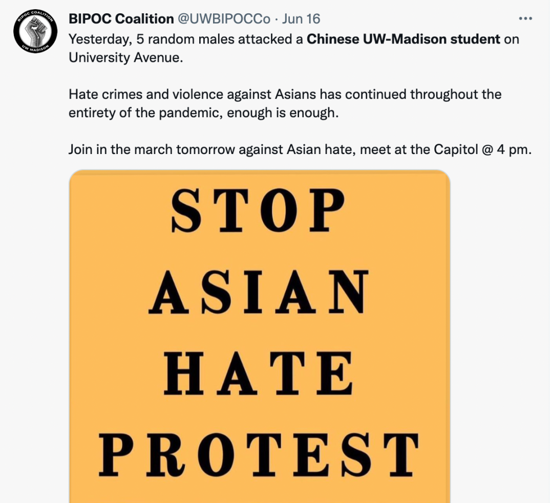 威斯康辛大学麦迪逊分校的血腥袭击事件发生之后,有学生们行动起来,组织了“停止亚裔仇恨”(Stop Asian Hate) 抗议活动。