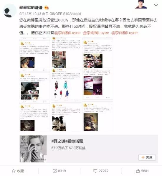 然而在12日-15日期间,薛之谦的一位粉丝因“求锤得锤”成功走红。在李雨桐爆出薛之谦骗财骗色的第二天,也就是13日,该粉丝一连列出薛之谦九张微博截图,质问李雨桐薛之谦泰国出车祸的时候她在哪?