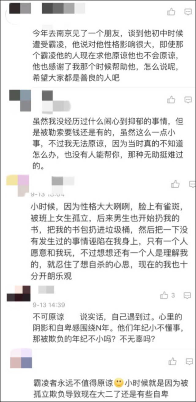 霸凌者:真的不好意思,因为当时年少轻狂。