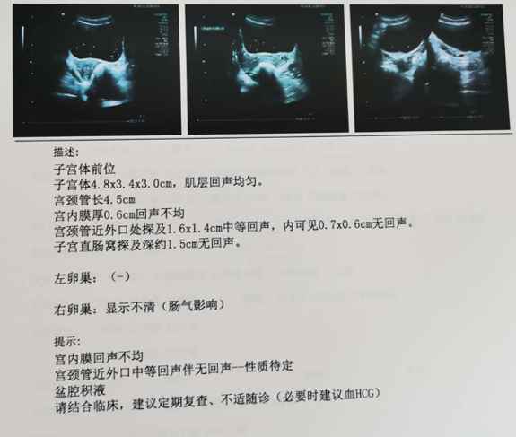 查体:精神状态差,重度贫血貌,查尿妊娠试验阴性,HCG <0.100 mIU/ml。