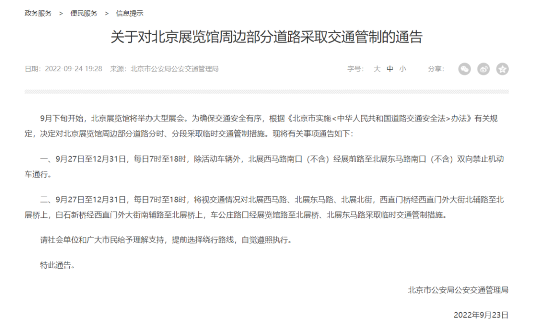 据北京市交管局9月23日消息,9月下旬开始,北京展览馆将举办大型展会。为确保交通安全有序,根据《北京市实施<中华人民共和国道路交通安全法>办法》有关规定,决定对北京展览馆周边部分道路分时、分段采取临时交通管制措施。现将有关事项通告如下: