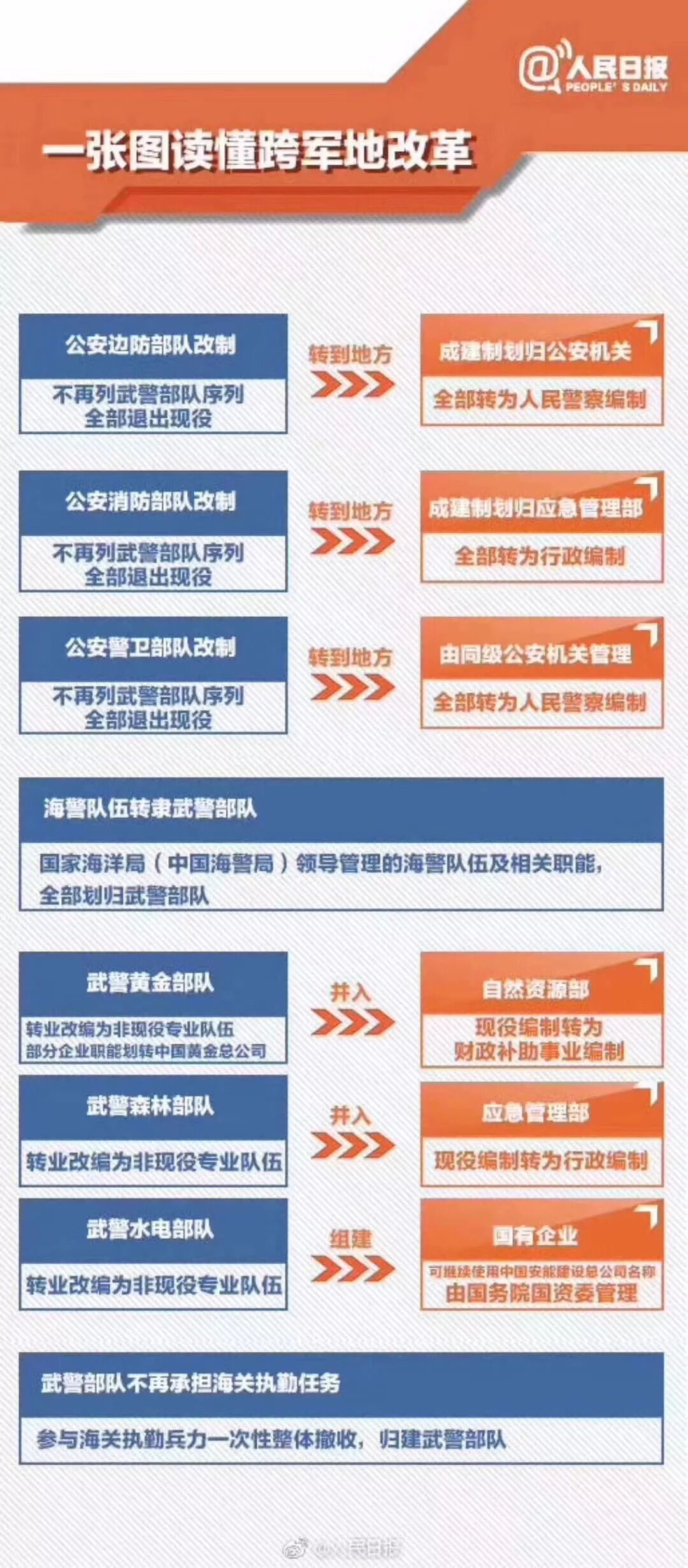 着眼全面落实党对人民解放军和其他武装力量的绝对领导,贯彻落实党中央关于调整武警部队领导指挥体制的决定,按照军是军、警是警、民是民原则,将列武警部队序列、国务院部门领导管理的现役力量全部退出武警,将国家海洋局领导管理的海警队伍转隶武警部队,将武警部队担负民事属性任务的黄金、森林、水电部队整体移交国家相关职能部门并改编为非现役专业队伍,同时撤收武警部队海关执勤兵力,彻底理顺武警部队领导管理和指挥使用关系。