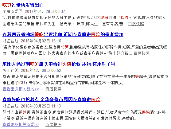 每年春天都会出现一个消化道出血的发病高峰,与春笋的大量上市也有很大的关系。很多人因为过多食用春笋,而导致消化不良、胃出血等等病症: