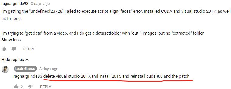 后来通过各种研究,发现有人和我碰到了一样的问题,最后开发者回答:因为执行训练时用的代码调用的是 CUDA 8.0( 最新的是 9.1,你特么研究这么先进的技术,环境能不能也用新的!?),而 CUDA 8.0 配套的 Visual Studio 插件最新的也只支持到 2015 版本,差评君用的是 2017,因此失败了。