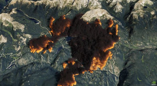 监测野火的无序蔓延是一件很困难的事情,Omniverse 需要考虑地形、树木、风速、风向等变量来模拟火情的模型。