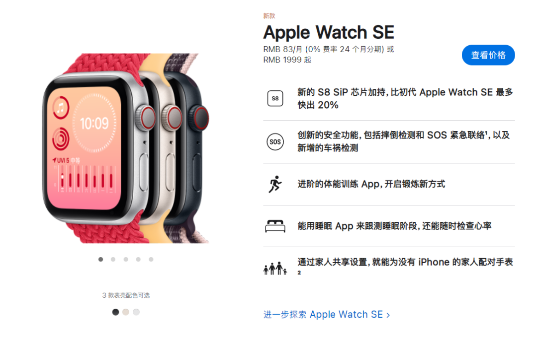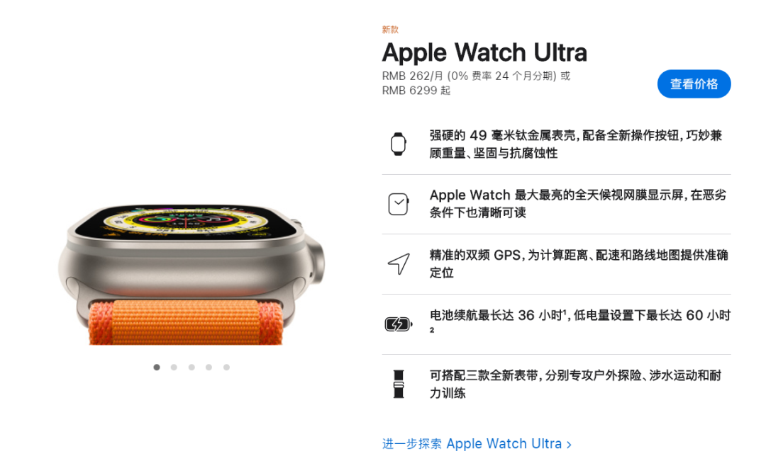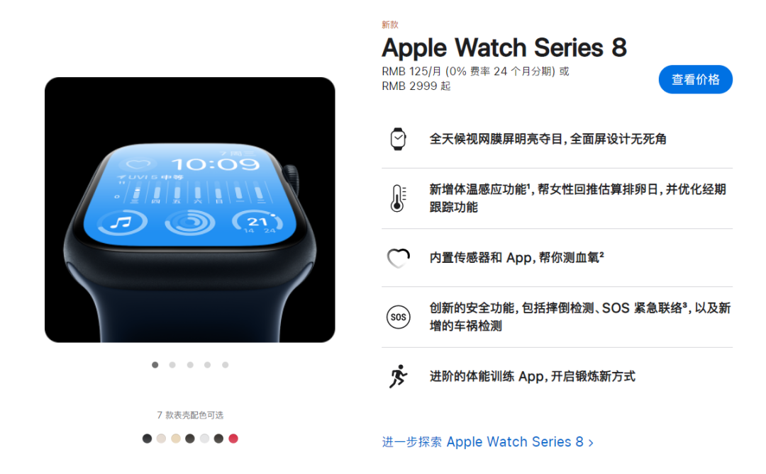 前面说完 iPhone ,接下来咱们再来说说 Apple Watch 。 苹果这些年来对 Apple Watch 的定位非常清晰,就是主打智能助理,健康、运动还有安全这四大功能,这次发布的三款 Apple Watch 也不例外。 其中 Apple Watch Series 8 顶多算是常规升级。 这款手表的外观、尺寸基本没变,除了把芯片从上一代 S7 升级到 S8 ,苹果还在手表里塞进去了更多的传感器,从而给它带来了几项新功能。 比如得益于 Apple Watch Series 8 搭载了全新的体温传感器,它这次新增的体温感应功能可以帮助女性更精确的估算排卵周期以及月经周期。 而全新三轴陀螺仪和加速感应器的加入,则为 Apple Watch Series 8 带来了车祸监测功能,一旦手表检测到发生车祸,它可以主动联系紧急救援和紧急联系人,并且提供位置信息。 总之在功能方面, Apple Watch Series 8 已经足够丰富了,它甚至可以做到比你男朋友还贴心, 2999 的起售价也与上一代持平。 就是它这个 18 小时的续航,实在是有点弱鸡,就算它这次新增的低电量模式可以让 Apple Watch Series 8 实现最长 36 小时的续航,但两天一充的频率在我看来还是有点高了。。。 至于新款 Apple Watch SE 没啥好说的。 它采用了与 Series 8 相同的 S8 芯片,并且还在上一代 SE 的基础上新增了车祸检测功能,不过外观依旧没变,只是后盖经过了重新设计,考虑到它 1999 的起售价,算是良心升级。 不得不说在旧瓶装新酒这件事上,还是苹果玩得溜啊,前有 iPhone SE 后有 Apple Watch SE ,不知道后续会不会还有其它 SE 产品的推出。 这次 Apple Watch 的重头戏,还得看 Apple Watch Ultra 。 Apple Watch Ultra 是苹果专门为户外探索、冒险还有耐力运动者推出的一款手表,我相信差友们只要看到这款手表的外观,应该就会感受到它扑面而来的硬核气息。 关键是它比普通版简直不要太耐操。 Apple Watch Ultra 采用 49 毫米的钛金属表壳,支持 100 米防水和 IP6X 级防尘,工作温度范围从 -20 ° C 到 55 ° C , 2000 尼特屏幕峰值亮度也比普通版直接翻了个倍。 表壳四周隆起的边框,能保护平面蓝宝石玻璃表镜免受冲击;而更大的数码表冠和凸出的侧边按钮,则可以方便我们即使戴着手套也能操作手表,有一说一这样的手表是真的帅! 而在功能方面, Apple Watch Ultra 配备三个内置麦克风,保证了手表在各种环境下的通话音质;内置的双频 GPS ,则可以为计算运动距离、配速以及路线地图提供精确定位。 除此之外, Apple Watch Ultra 还搭载了全新深度计,能支持最大深度 40 米的休闲水肺潜水和自由潜水活动;而内置的 86 分贝警笛,足以让最远 180 米外的人听见手表呼救声。 为此苹果还专门给这款手表设计了能显示最多信息的「 寻路者 」表盘: 新出的高山回环式表带、海洋表带以及野径回环表带,则分别专攻户外探险、涉水运动和耐力训练。 最关键的是, Apple Watch Ultra 续航最长可达 36 小时,低电量设置下它的续航甚至长达 60 小时,堪称有史以来续航最长的 Apple Watch 。 但它 6299 的价格嘛,都顶得上一台 iPhone 了,不过我寻思着户外运动者应该也不差钱?