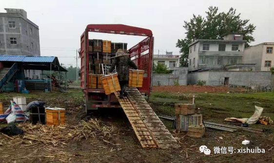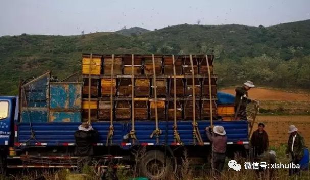 人工挑两三百箱蜜蜂上车迁移赶花季。