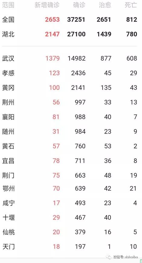 截至2020年2月8日24时,湖北省累计报告新型冠状病毒肺炎病例27100例,其中:武汉市14982例、孝感市2436例、黄冈市2141例、荆州市997例、襄阳市988例、随州市984例、黄石市760例、宜昌市711例、荆门市663例、鄂州市639例、咸宁市493例、十堰市467例、仙桃市379例、天门市197例、恩施州171例、潜江市82例、神农架林区10例。全省累计治愈出院1439例。全省累计死亡780例,病死率2.88%,其中:天门市10例、病死率5.08%,武汉市608例、病死率4.06%,鄂州市21例、病死率3.29%,荆门市19例、病死率2.87%,潜江市2例、病死率2.44%,黄冈市43例、病死率2.01%,仙桃市5例、病死率1.32%,荆州市13例、病死率1.30%,孝感市29例、病死率1.19%,宜昌市8例、病死率1.13%,随州市9例、病死率0.91%,咸宁市4例、病死率0.81%,襄阳市7例、病死率0.71%,黄石市2例、病死率0.26%。目前仍在院治疗20993例,其中:重症4093例、危重症1154例,均在定点医疗机构接受隔离治疗。现有疑似病例23638人,其中集中隔离12918人,当日排除1128人。累计追踪密切接触者123827人,尚在接受医学观察70438人。