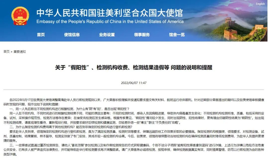 专家表示“假阳性”情况较少发生,同时出现阴性、阳性结果时,更有理由怀疑阴性结果为“假阴性”。使馆建议大家当出现不利检测结果,请客观理性看待,重新规划行程,并按要求做好后续检测和健康监测,勿轻易听信一些“博主”“群主”不负责任的“攻略”。