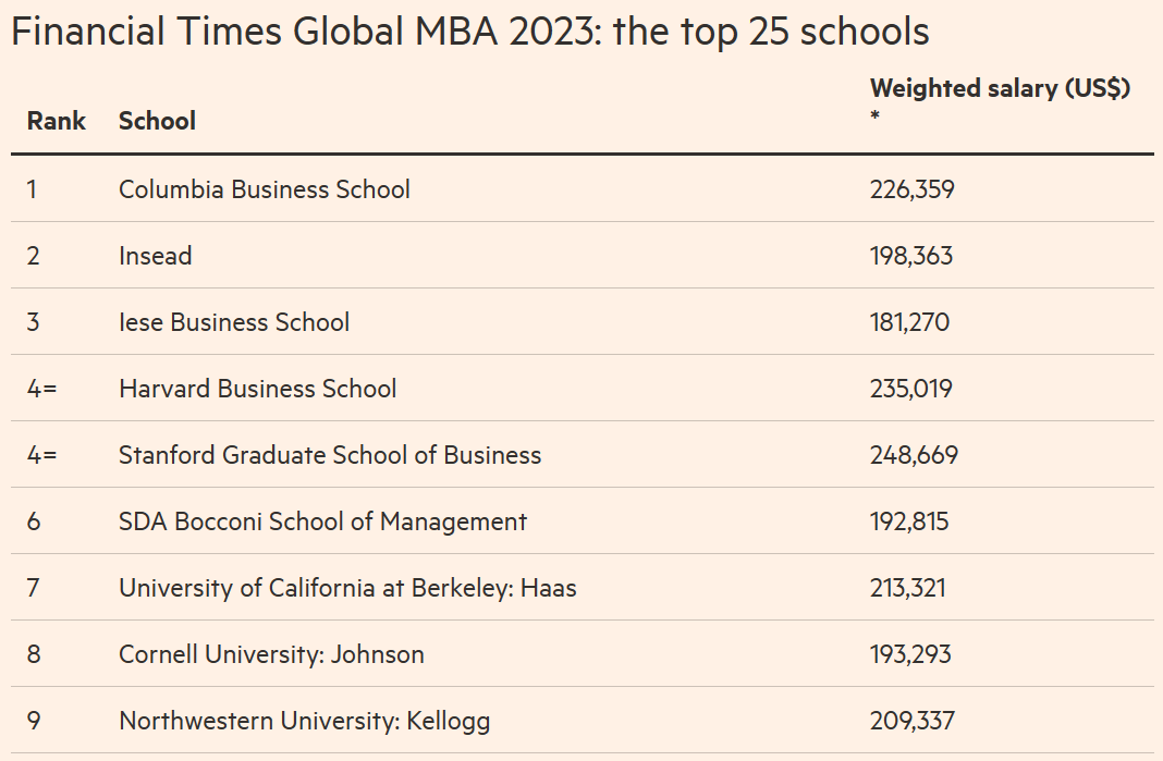 哥伦比亚商学院(Columbia Business School)在英国《金融时报》MBA排行榜25年历史上首次排名第一。它的成功在一定程度上是因为校友的平均加权薪酬排名第三,为226,359美元。该学院在职业发展方面的排名也上升了5位,至第15位,这在一定程度上是基于毕业生资历水平的变化。一名接受调查的校友表示:“哥伦比亚大学的MBA课程在职业和个人方面都完全改变了我,为我打开了一个充满机会的全新世界。”