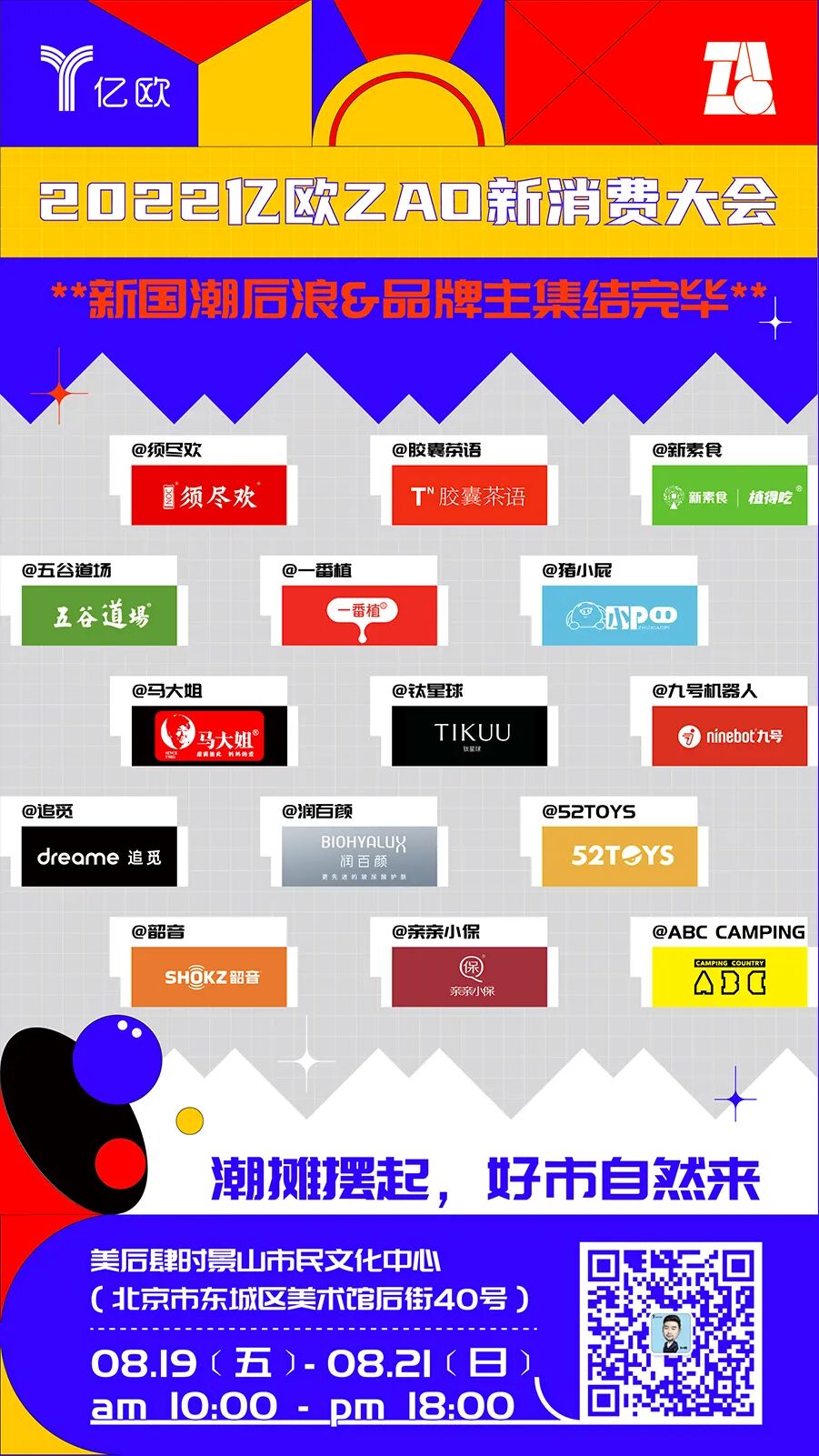 8月19-21日,由亿欧主办的新国潮主题ZAO集市也即将在北京·美后肆时正式拉开帷幕。本次活动集结了伊利、胶囊茶语、新素食等知名国货品牌,为大家带来一场ZAO动全场的国潮盛宴。欢迎小伙伴们组团前来打卡,于这夏末秋初之刻,一起在“潮滩好市”中解锁精彩和快乐。