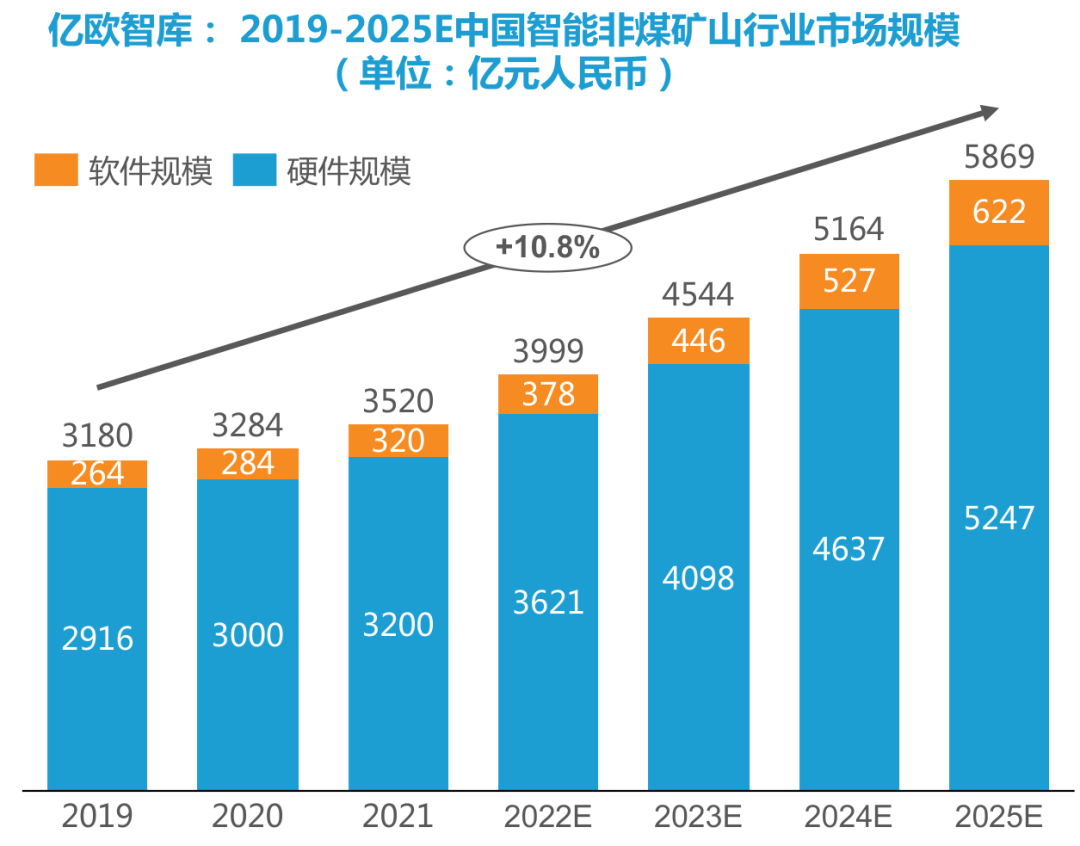 目前行业厂商针对煤矿智能化的解决方案较为成熟,但在非煤矿山数字化与智能开采领域,拥有成熟积累的只有迪迈科技等少数企业。而非煤矿山越复杂,实际上也意味着其数字化与智能开采的市场空间会比煤矿更大。据亿欧智库《2022中国智能矿山产业发展白皮书》,2021年中国非煤矿山总数超过3万座,非煤矿山数字化和智能开采业务需求快速增长,预测2019到2025年年复合增长率将达到10.8%,增速超过煤矿,2025年非煤矿山数字化与智能开采市场规模将达到5869亿元。