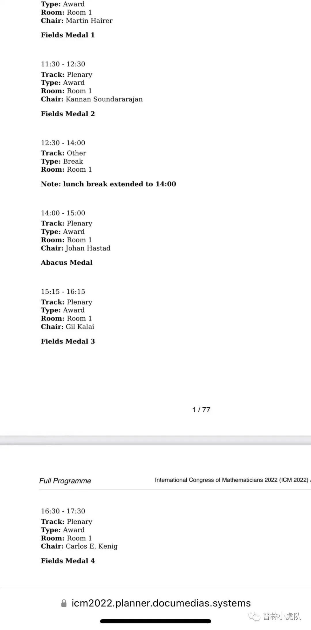 从图中可见,这一天主要是菲尔兹奖得主和IMU算盘奖得主作全会报告。有趣的是,报告主持人在日程表中也列举出来了。按照常理,主持人的研究领域跟报告人应该比较接近,这使得我们能够从主持人的身份推测出获奖者到底会是谁。按说这算是泄密了,不知道是不是因为第一次在网络上举办国际数学家大会,缺乏经验