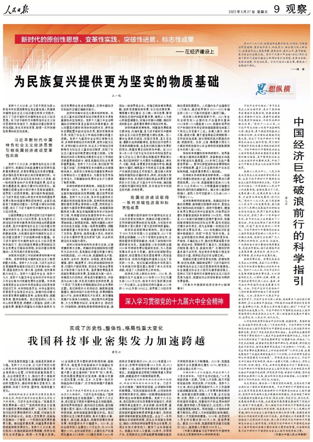 党的十八大以来,我国经济发展平衡性、协调性、可持续性明显增强,国家经济实力、科技实力、综合国力跃上新台阶,我国经济迈上更高质量、更有效率、更加公平、更可持续、更为安全的发展之路。党的十九届六中全会《决议》深刻总结了新时代在经济建设上取得的原创性思想、变革性实践、突破性进展、标志性成果。今天刊发的3篇文章,围绕这一主题进行阐述。