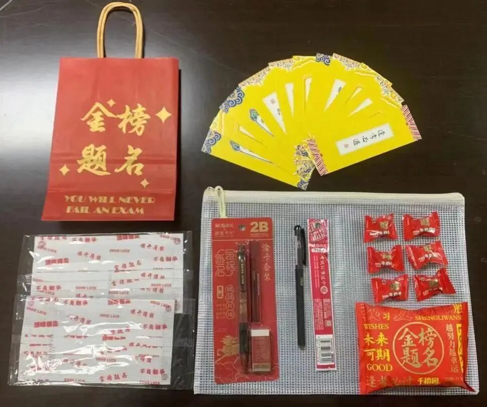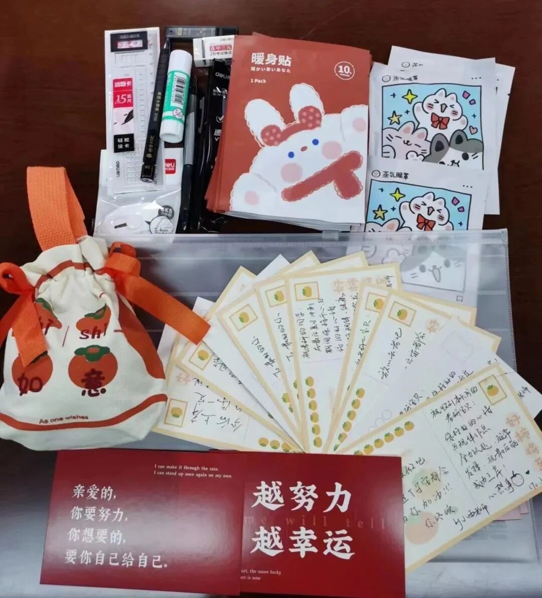 装有文具、零食、“逢考必过”明信片等