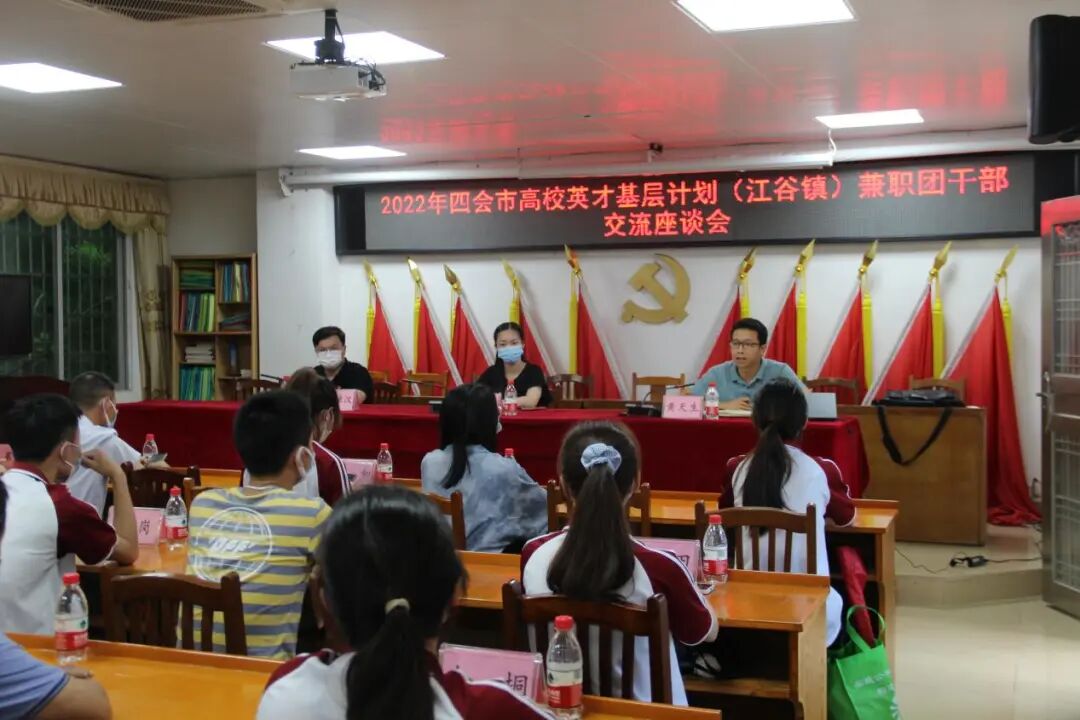 2022年四会市高校英才基层计划(江谷镇)兼职团干部交流座谈会顺利举行。参与座谈会的领导和嘉宾有:四会市青少年宫曾丽娟女士,江谷镇党委委员、团委黄天生书记,广州华商学院四会校区陈禄汉老师,江谷镇团委、各村居团支部团干,广州华商学院四会校区青年学生代表。会议由江谷镇党委委员、团委黄天生书记主持。