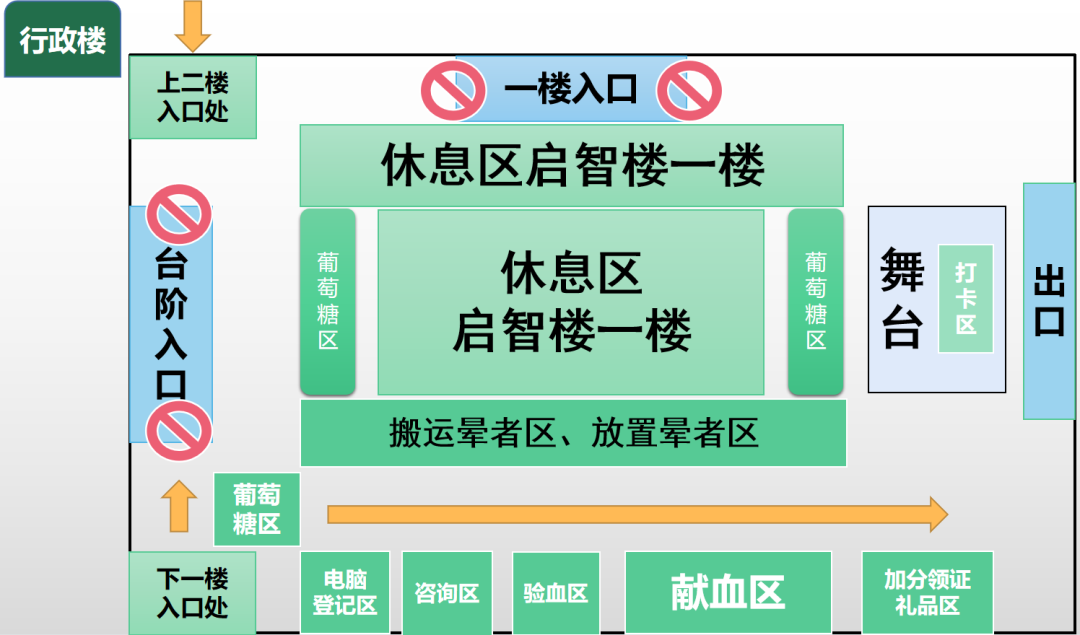 体检入口(上二楼)→等候区→信息登记→等候区→测量体重血压→等候区→体检出口(下一楼)→葡萄糖区→电脑登记处→咨询区→验血区→献血区→休息等候区→加分登记处→礼品区→活动出口