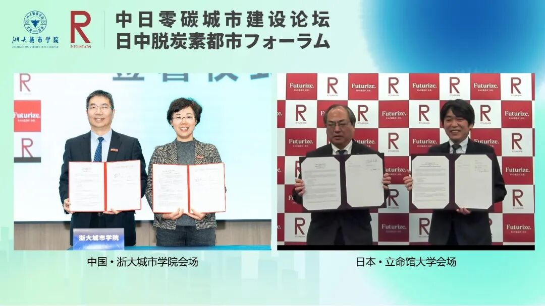 为进一步加强合作与联系,共创未来宜居城市,论坛现场还举行了浙大城市学院与立命馆大学,浙大城市学院商学院与立命馆大学可持续发展学研究中心的学术交流协议签署仪式,未来两校将在科学研究、学科建设、人才培养等方面开展更深层次、更广领域的合作发展。