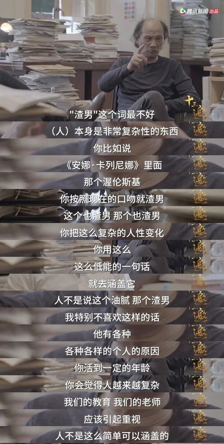 小说家金宇澄的看法与北岛相似,在最近的一期《十三邀》中,他痛批“渣男”一词,认为这是用空洞的符号僭越丰满的人性。
