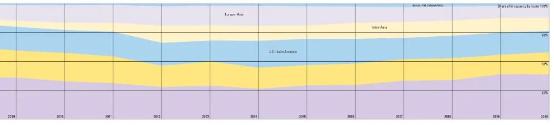 可以看到,跨大西洋的欧美之间,仍是数据传输最繁忙的线路,而近十年来,跨太平洋,以及欧亚之间的数据传输,占比缓慢下降,原因也许众所周知。有一个冷知识,大洋洲与南美洲之间至今没有直接的海缆相连。