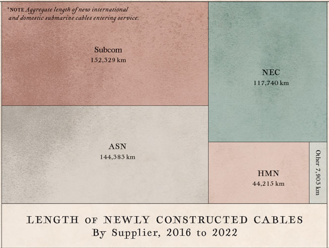 海底光缆的铺设,是一种高投资、高专业度的工程,当今基建的工作仍由少数的大型公司控制。按照光缆铺设长度,最大的建设公司是 Subcom(美国)、ASN(欧洲)、NEC(日本),近年来,中国的 HMN Tech(华海通信,原华为海洋电缆)也开始承建了许多光缆业务。