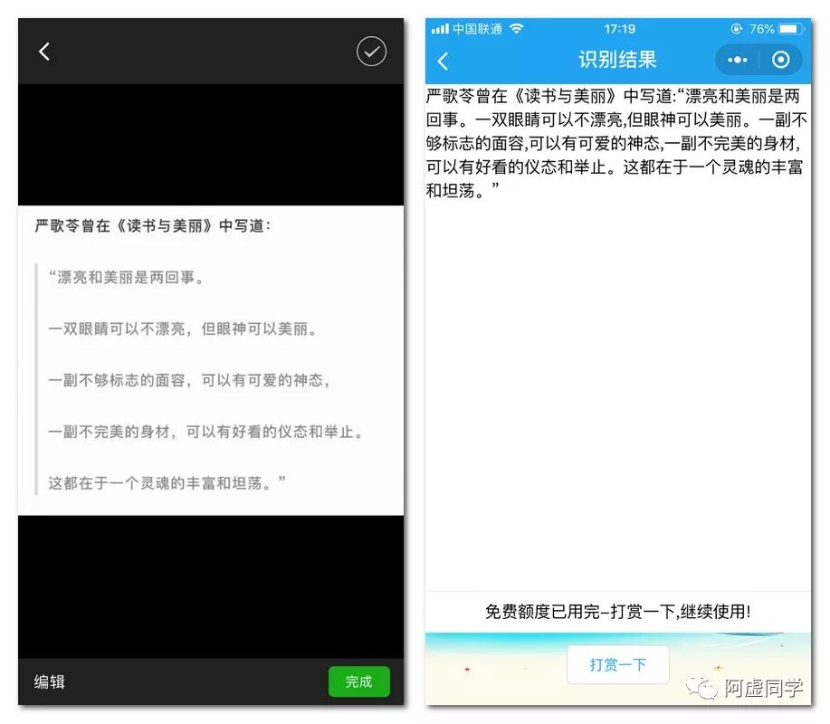 测试了很多小程序,只有这一款能把左边这段文字完美一字不差(符号也不差)的识别出来。