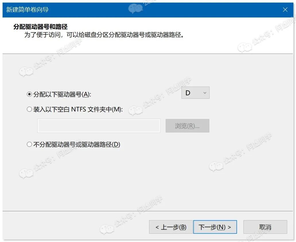 把剩下的空间全填进去后一路下一步,分配驱动器号这里重新分配为D盘,再点下一步就行了