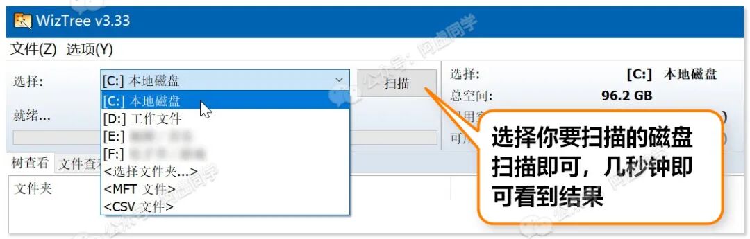 WizTree的使用很简单,绿色软件下载即用,打开后选择你要扫描的磁盘即可: