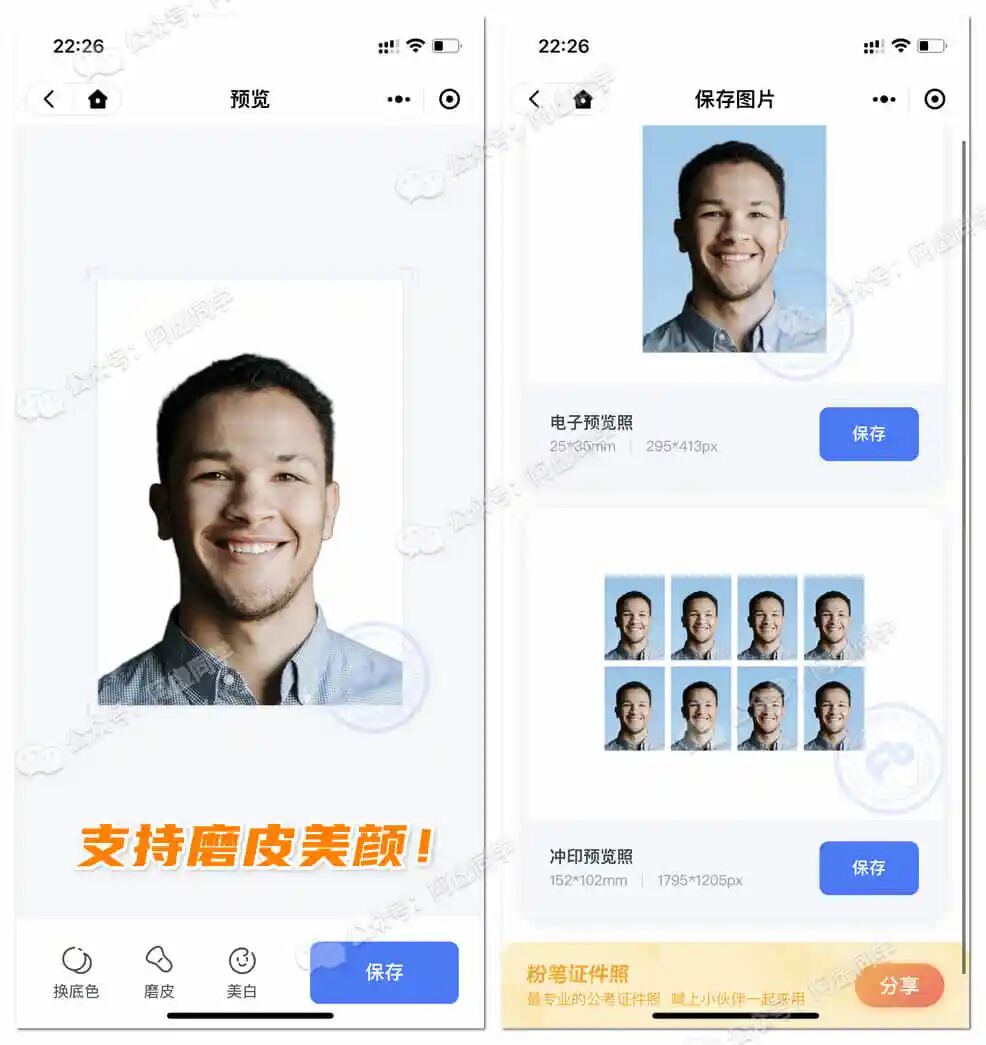 支持磨皮美颜,并且除了提供单张证件照照片,还提供冲印版图片!