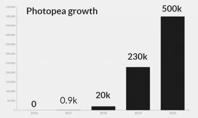 不过也正因为不用面临高昂的服务器费用,Photopea 才能一直作为免费的产品提供给大家,为每天超过30W个用户服务(还在持续增长中)