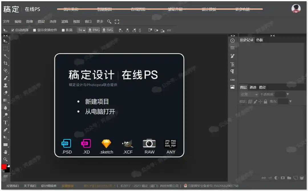 原版 Photopea 首次打开可能会比较慢,稿定版服务器毕竟在国内,加载速度会更快一点