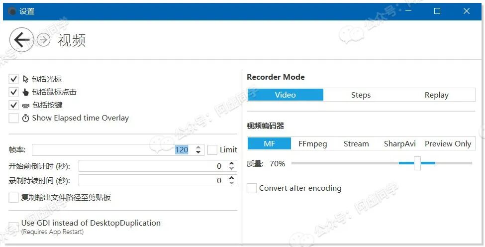 同时你可以在软件设置 » 视频中设置是否录制鼠标、鼠标点击、按键操作!Captura 还支持任意帧率录制,120帧当然是没问题的