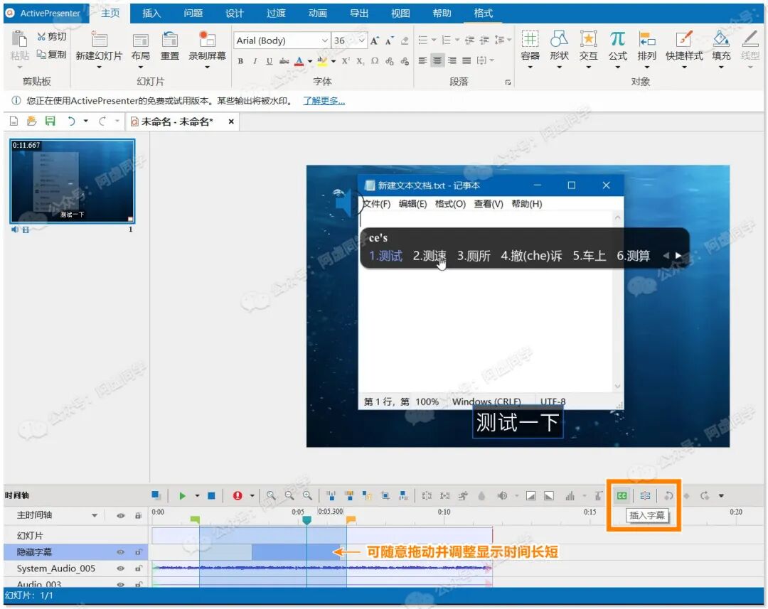 有过视频编辑经验的人,对于视频轨、字幕轨这些应该都很明白,在 ActivePresenter 中添加字幕和在其他视频编辑软件里面添加字幕是差不太多的