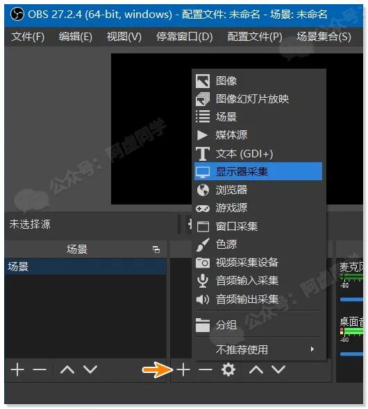 软件界面看起来挺复杂,但使用OBS来录屏其实也很简单,点击来源面板左下角的加号 + ,在弹出的面板中,根据自己的需要选择「显示器采集」或者「窗口采集」、「浏览器」等