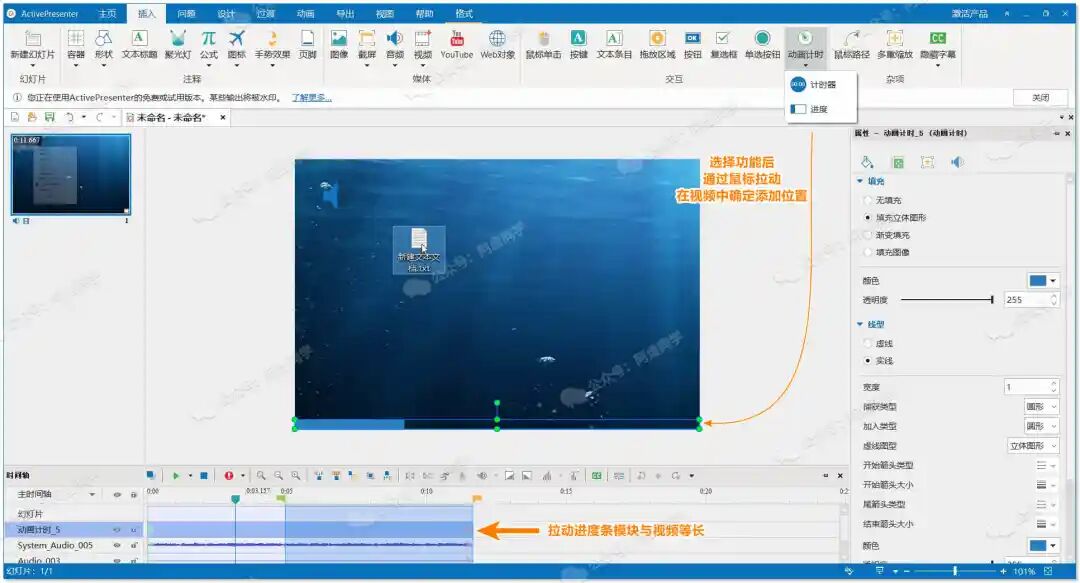 在插入功能这里,有一个动画计时功能,你可以很方便的给视频添加一个计时器或者进度条