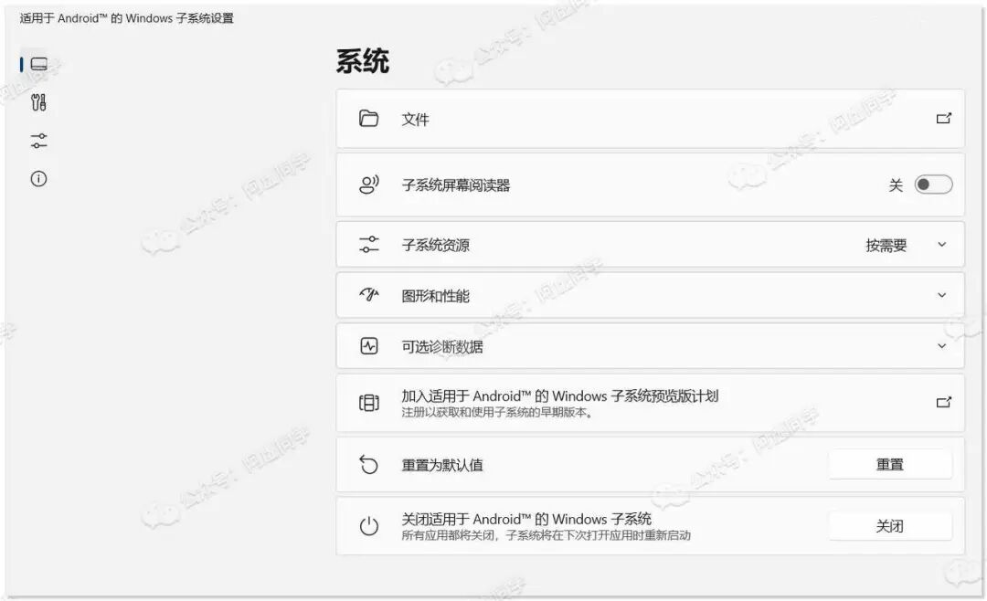 上图第4个「适用于Android的Windows子系统」是 WSA 的设置中心,可以查看 WSA 的版本、已安装的应用,文件管理、以及开启调试、性能设置、图形设置等