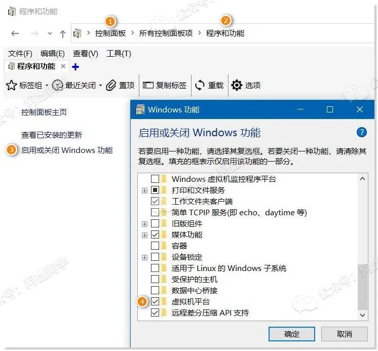 由于安装 WSA 子系统需要虚拟机平台支持,所以在安装之前必须打开控制面板 » 程序和功能 » 启用或关闭Windows功能,在列表中勾选「虚拟机平台」功能:
