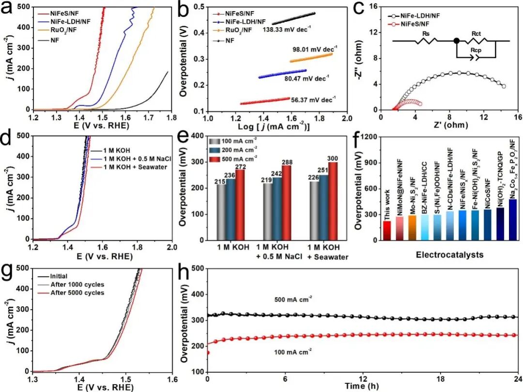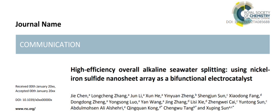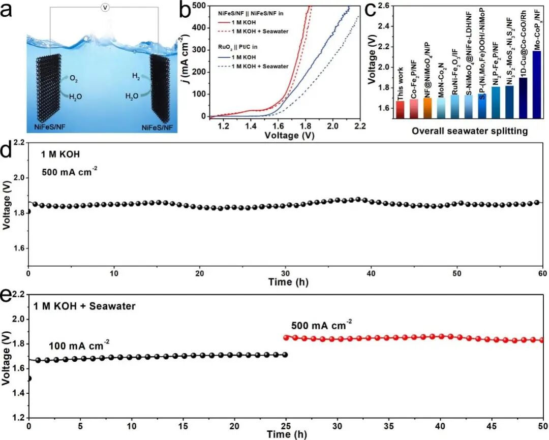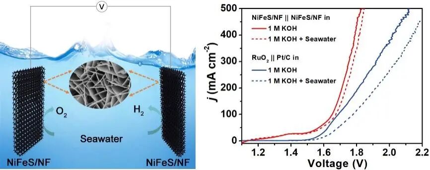 高效全碱性海水分解:以镍铁硫化物纳米片阵列作为双功能电催化剂