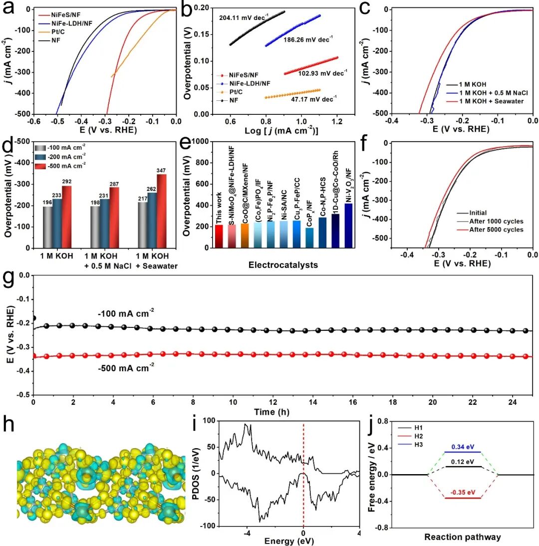 图4. NiFeS/NF催化剂的HER性能及DFT计算。