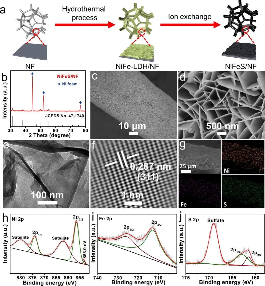 通过原位水热生长、离子交换步骤在泡沫镍上制得镍铁硫化物纳米片阵列(NiFeS/NF)。通过XRD、SEM、TEM、XPS等表征技术对NiFeS/NF进行了详细的表征(详见原位,这里不在赘述)。
