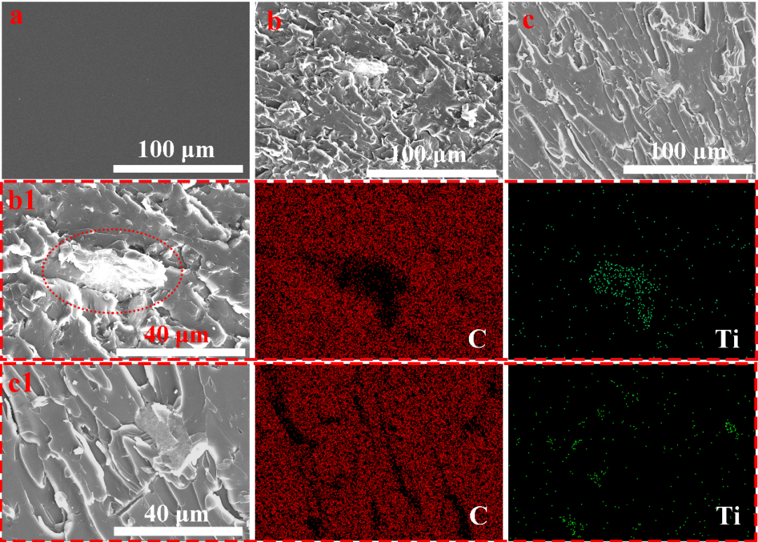 图4. 复合材料液氮脆断截面SEM图(a)EP,(b)EP/MX-2.0,(c)EP/MX-P-2.0;更高倍数的SEM图及其对应的表面元素分布图EP/MX-2.0(b1),EP/MX-P-2.0(c1)![]()