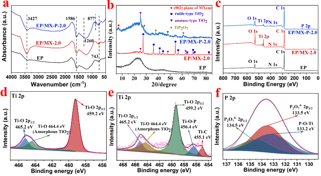 图7. 锥形量热测试后残炭的FTIR(a),XRD(b),XPS总谱(c);钛元素的XPS分峰谱图EP/MX-2.0(d),EP/MX-P-2.0(e)以及磷元素的XPS分峰谱图(f)通过对残炭的组成和结构表征,发现EP/MX-P-2.0的残炭相比于EP/MX-2.0的残炭,其组成更加复杂,出现了有机磷系化合物和焦磷酸钛等,并且通过XRD图中MXene二维层间距特征峰002峰(5-10°处),证实了MXene-PZN在燃烧后仍然保持了部分二维结构。![]()
