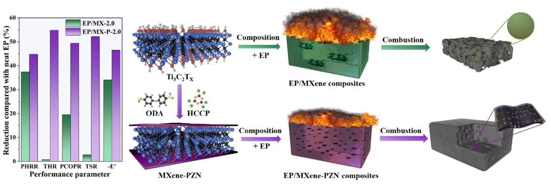 图1 TOC MXene与MXene-PZN对EP的增强效果和阻燃机理对比![]()