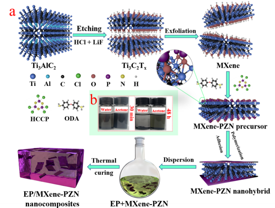 图2.(a)复合材料EP/MXene-PZN制备示意图;(b)Ti3C2TX与MXene-PZN在不同溶剂中分散情况PZN改性MXene的制备过程如图2所示。研究团队通过阶段式升温的方法控制六氯环三磷腈与二氨基二苯醚在Ti3C2TX表面的自聚合反应,成功制备了MXene-PZN,TEM、SEM表征证明了改性后Ti3C2TX的二维层状结构得到很好的维持。![]()