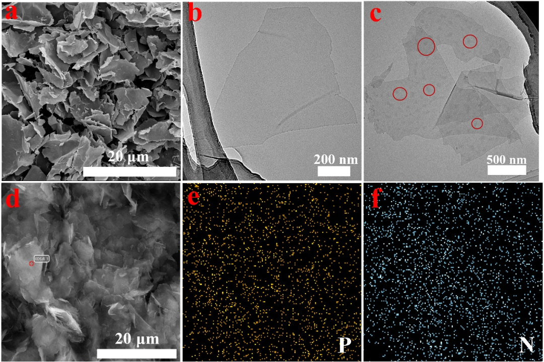图3. Ti3C2TX扫描电镜图(a)及透射电镜(b);MXene-PZN透射电镜图(c)、扫描电镜图(d)及其对应的表面元素分布图:磷(e)、氮(f)研究团队通过溶剂共混的方法制备复合材料,并通过扫描电镜分析了改性前后Ti3C2TX及MXene-PZN在基材中的分散情况。研究结果表明,在添加量均为质量分数的2 %时,未改性的Ti3C2TX在基材中发生了明显团聚(图4b),而改性后MXene-PZN能够均匀的分散在EP基材(图4c)中。MXene-PZN在EP基材中良好的分散效果为提升复合材料应用力学性能,充分发挥协同阻燃效应奠定了基础。![]()